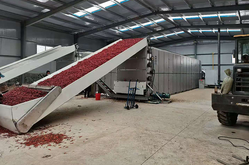 辣椒烘干機(jī)由4個部分組成,分別是上料輸送機(jī)、網(wǎng)帶式烘干機(jī)主機(jī)、熱源、出料輸送機(jī)。轉(zhuǎn)換爐提供熱量;網(wǎng)帶式穿流干燥機(jī)是干燥設(shè)備的主體,由機(jī)體和多層輸送帶組成;電控系統(tǒng)控制整個設(shè)備的啟動、運(yùn)轉(zhuǎn)與停止。