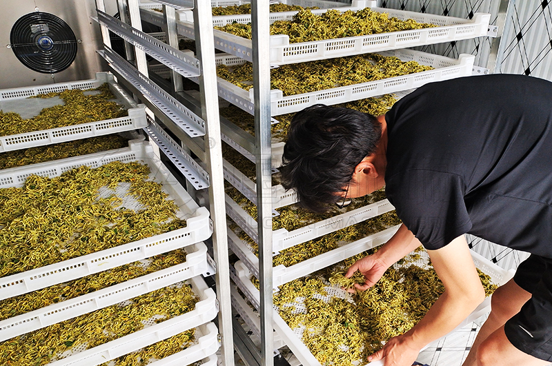 第二階段:烘干房溫度逐漸從41攝氏度提升至48攝氏度,此溫差的提升時間掌控在5~7個小時逐漸完成,一定不可超過50攝氏度的溫度范圍,同時保持同樣的排濕速度;金銀花經過9~13個小時的初始、中度烘干和強排濕基本達到5成干燥;